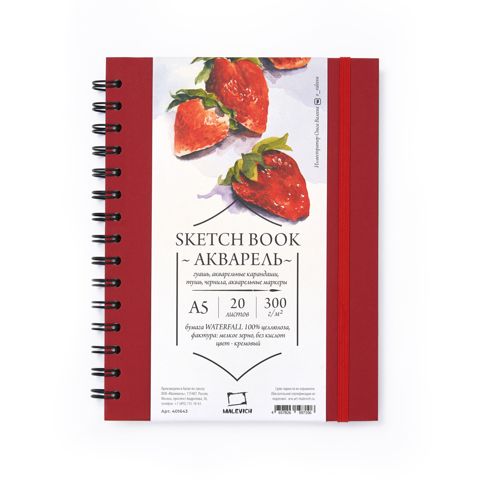 Скетчбук для акварели ЛАДОГА 300г/кв.м (А5) 148х210мм 20л. красный среднее зерно хлопок 100%