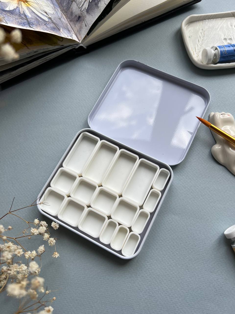 Пенал для акварели в кюветах БЕЛЫЕ НОЧИ 21 кювета пустой металлический светло-голубой