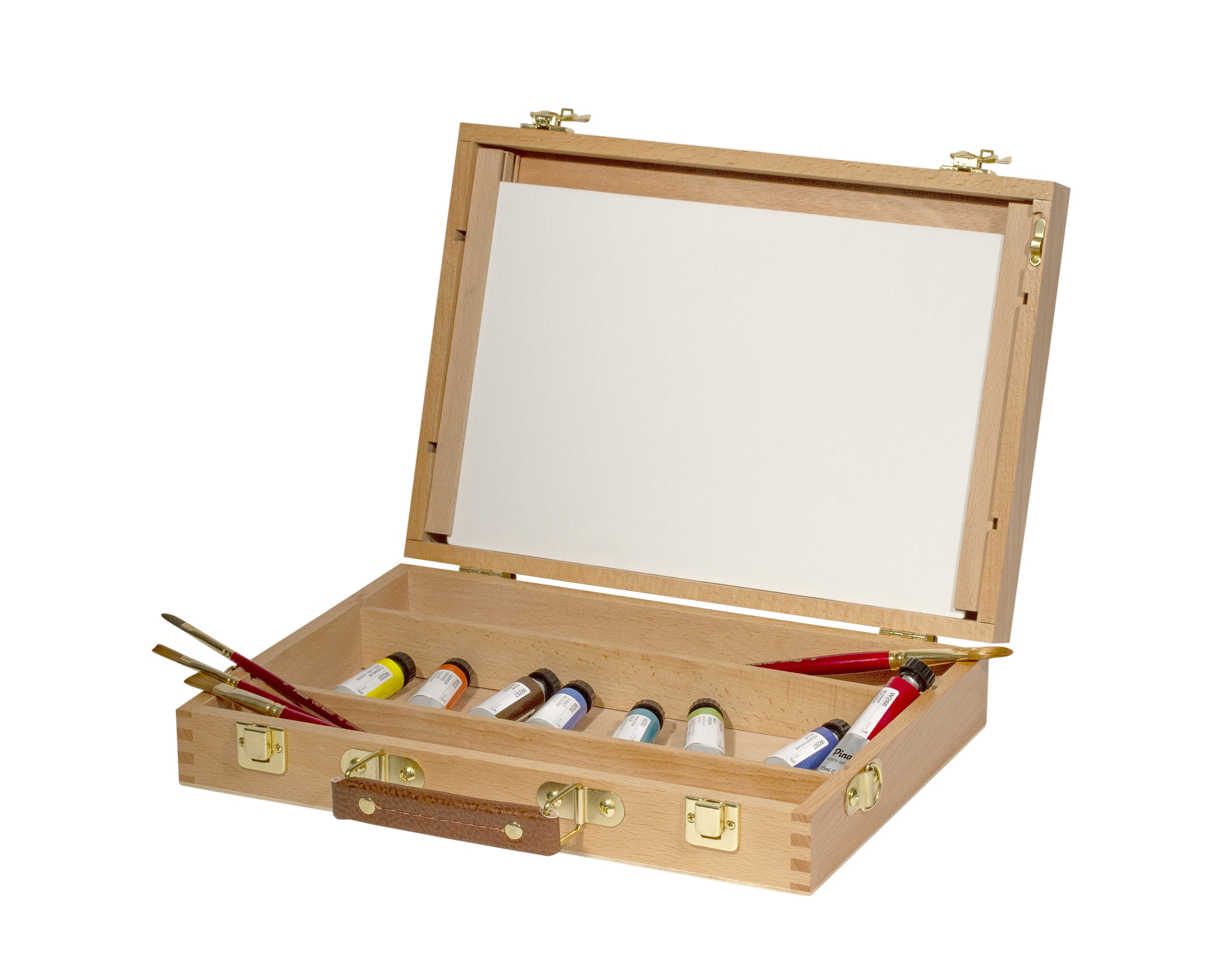 В корпусе размещены крепления для двух холстов на картоне размером 20х30см, предусмотрено место для палитры прямо над отделениями для художественных принадлежностей.